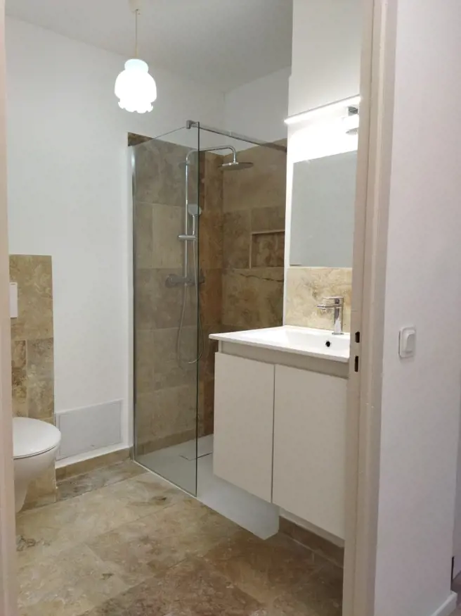 salle de bain : douche à l'italienne, wc, lavabo, chauffage.
