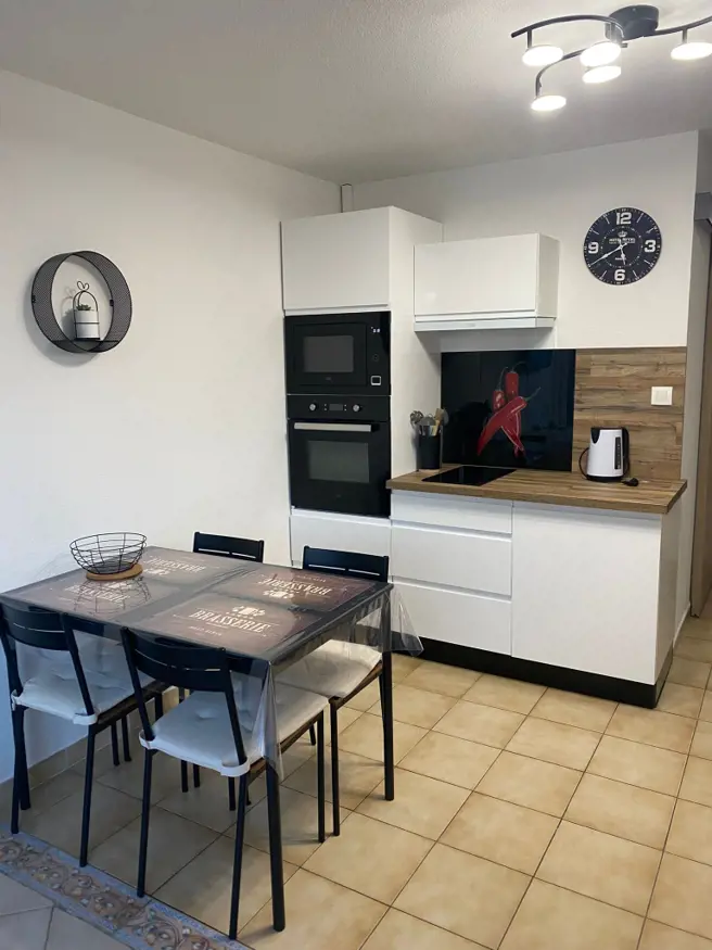 Une cuisine équipée avec plaque 2 feux induction, hotte, un grand four, un micro-onde, grille-pain, bouilloire, frigidaire-congélateur encastré, un lave vaisselle, une machine à laver, cafetière Classique et expresso, meuble de rangement, ustensiles de cuisine, vaisselle, jeux de sociétés etc