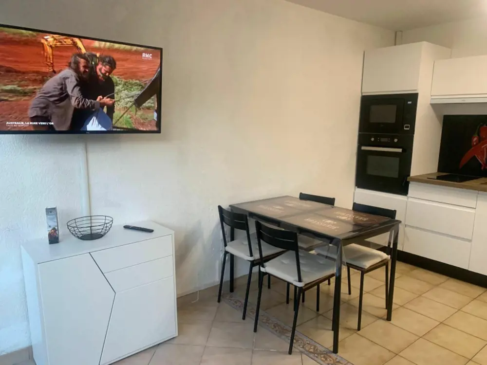 Une pièce à vivre climatisée : une table, 4 chaises, un grand écran TV orientable, Wifi et climatisation réversible un canapé convetible