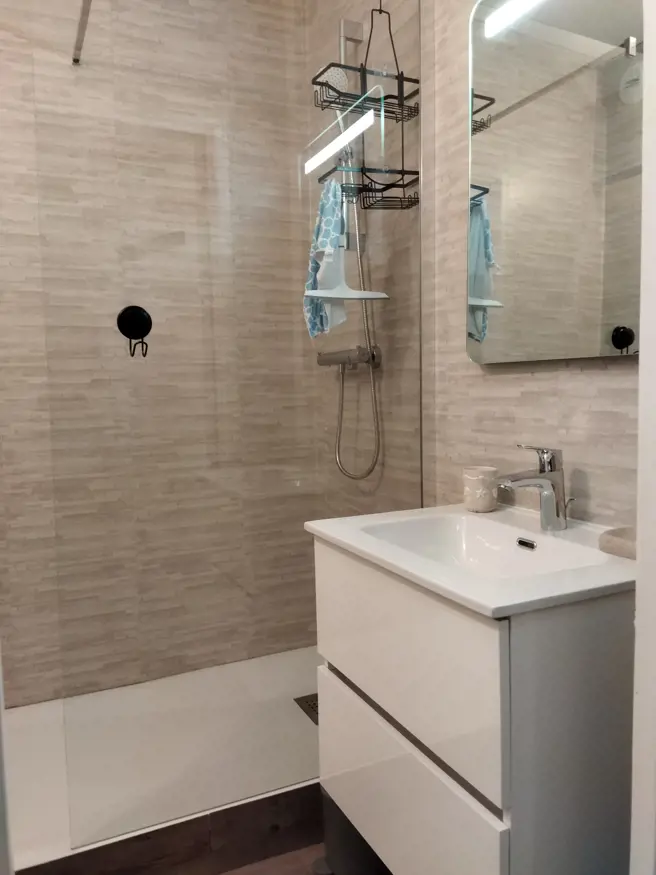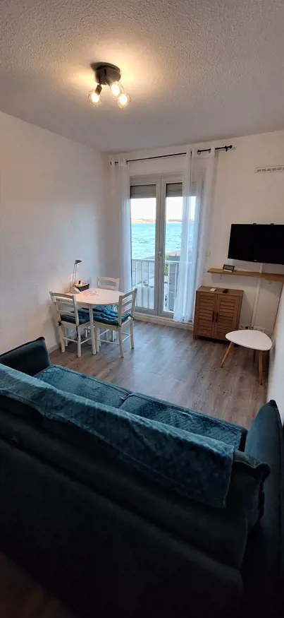 • Pièce à vivre : canapé-lit Rapido 2 places (neuf 160x190), fauteuil relax, TV, un meuble de rangement, table + 3 chaises