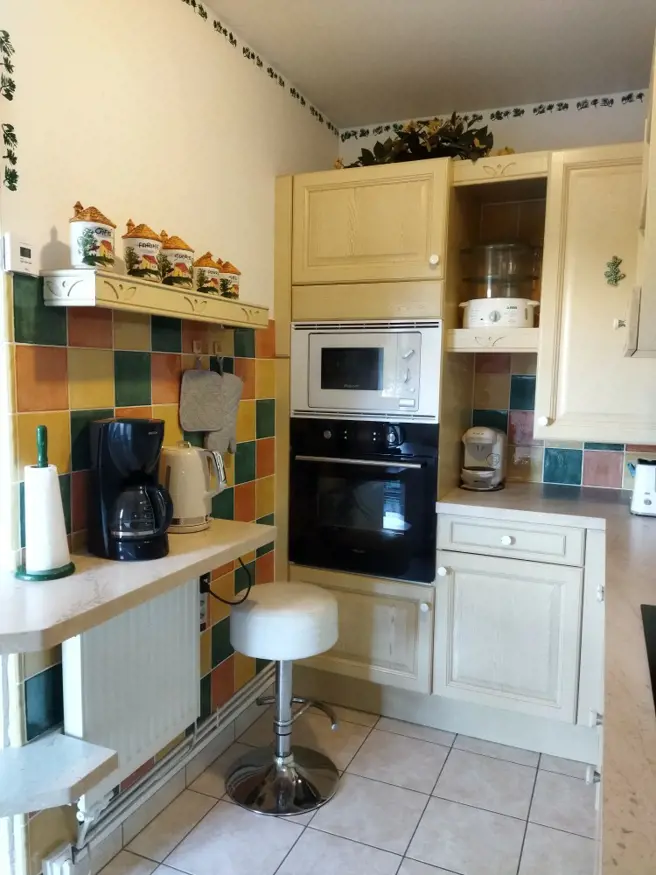 Lave-vaisselle • Plaque induction 4 feux • Hotte • Four • Micro-ondes • Réfrigérateur-congélateur • Cafetière Tassimo + classique • Grille-pain • Bouilloire • Ustensiles complets