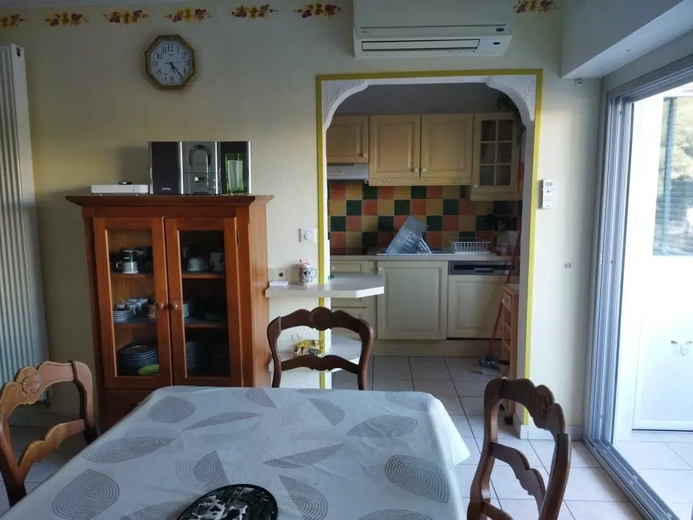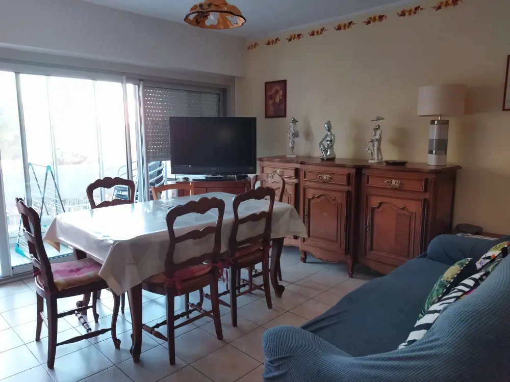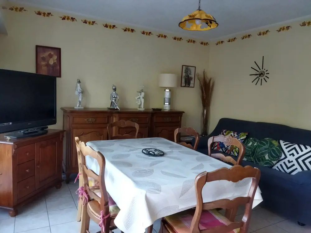 Table à rallonges • 6 chaises • Bahut 3 portes • Canapé convertible • TV écran plat • Lecteur DVD • Jeux de société